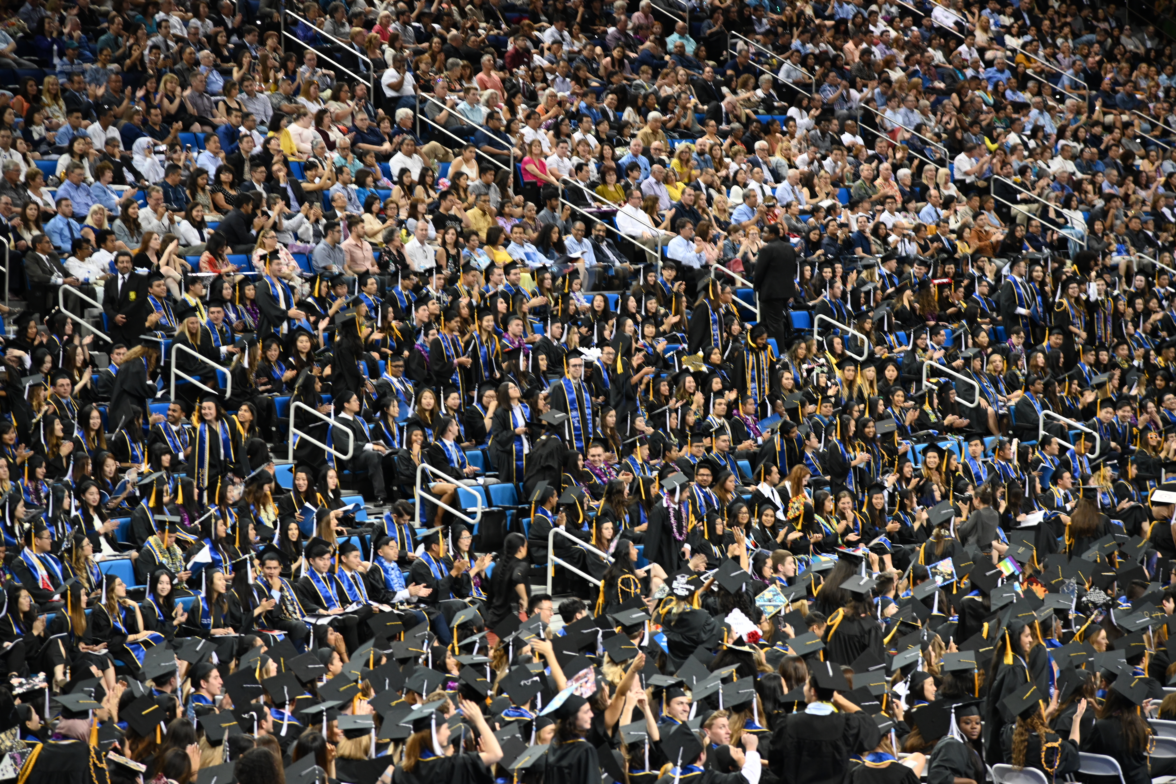 Bruce graduated from the College of Letters & Science on Friday, then walked the stage as part of the Psychology Department ceremonies early Saturday morning. Here he is, in the middle of a crowd, about to take his seat — can you find him? (Click image for full-sized version)