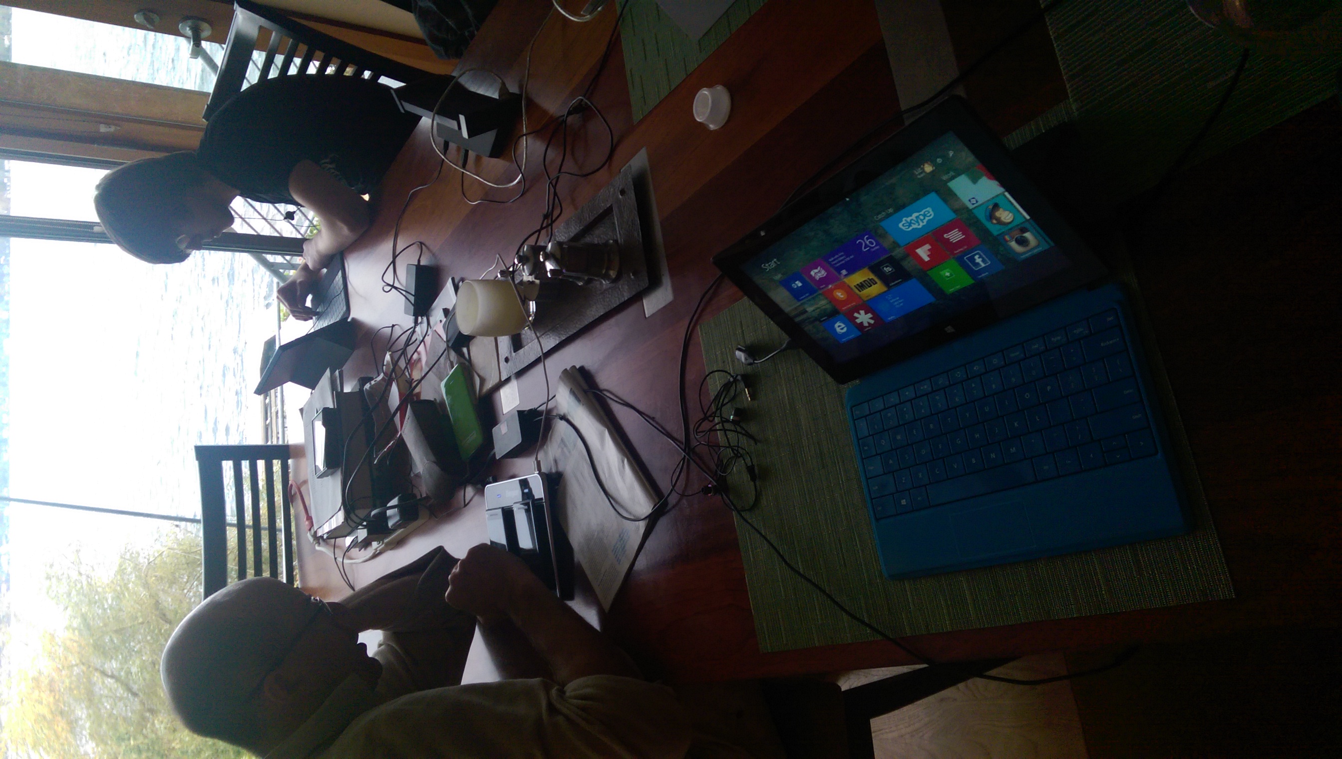 Not quite… From a few working outlets in the kitchen, we extended power over to the dining room table, for the all-important charging stations. Next, we fired up a network hotspot, and all of us stayed happily connected to the interwebs on our phones and tablets.